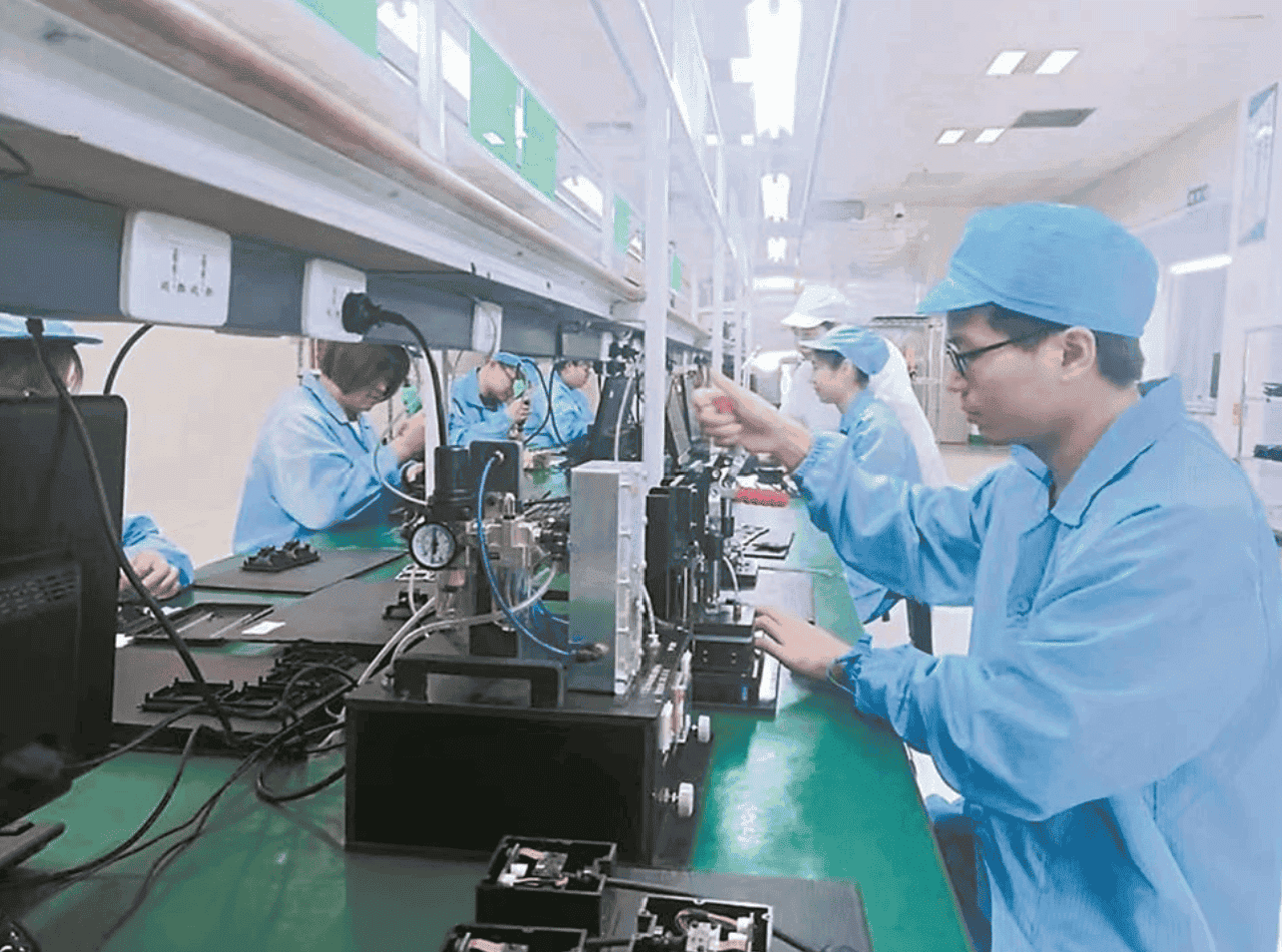 近日,記者走進福建新大陸自動識別技術有限公司中試車間,身著藍色制服的工人正忙碌著調試設備,對產品做防水測試。