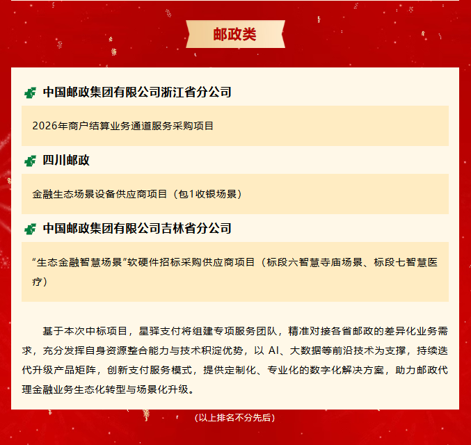 篤行不怠,喜訊頻傳!近期,福建星驛支付科技有限公司(簡稱“星驛支付”)中標喜訊頻傳,憑借靈活的產品適配能力、豐富的場景建設經驗及深厚的數字商業領域積淀,在激烈競爭中脫穎而出,獲得多家主流銀行及中國郵政的高度認可,成功中標多項核心項目,為深化數字商業布局奠定堅實基礎。